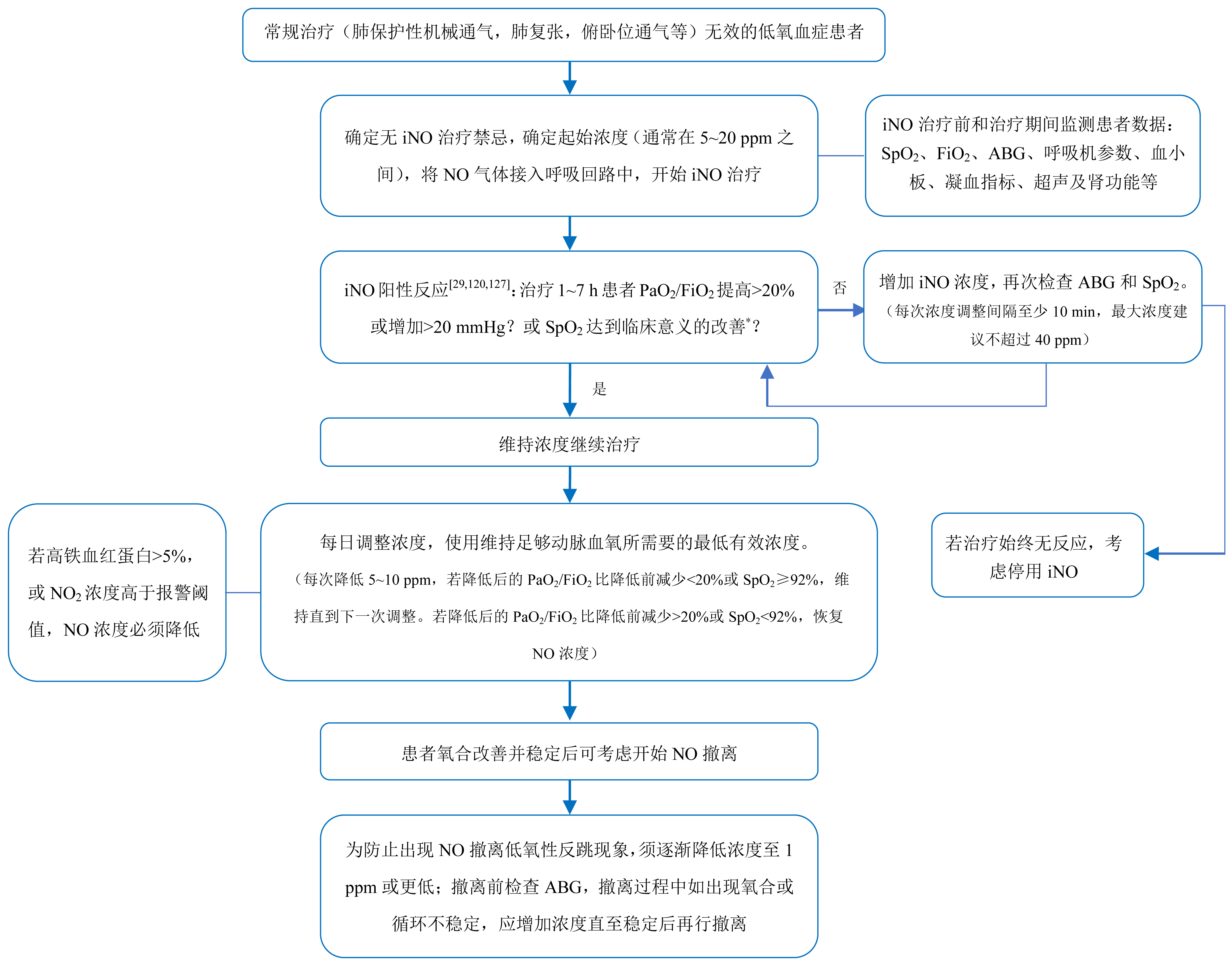 | 急性呼吸窘迫综合征 | 常规治疗无效者,可以考虑加用iNO,常用的浓度范围5~20 ppm,建议使用NO最低有效浓度维持动脉氧合,疗程视患者临床反应而定,最长可达30 d;可考虑联合俯卧位通气改善氧合 |