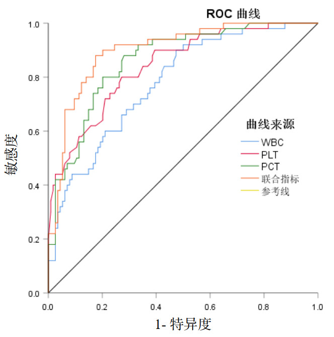 图 1 PLT、AST、PCT及联合检测在诊断重症HFRS的受试者操作特征曲线 Fig 1 Receiver operating characteristic curve of PLT, AST, PCT and combined detection in the diagnosis of severe HFRS |