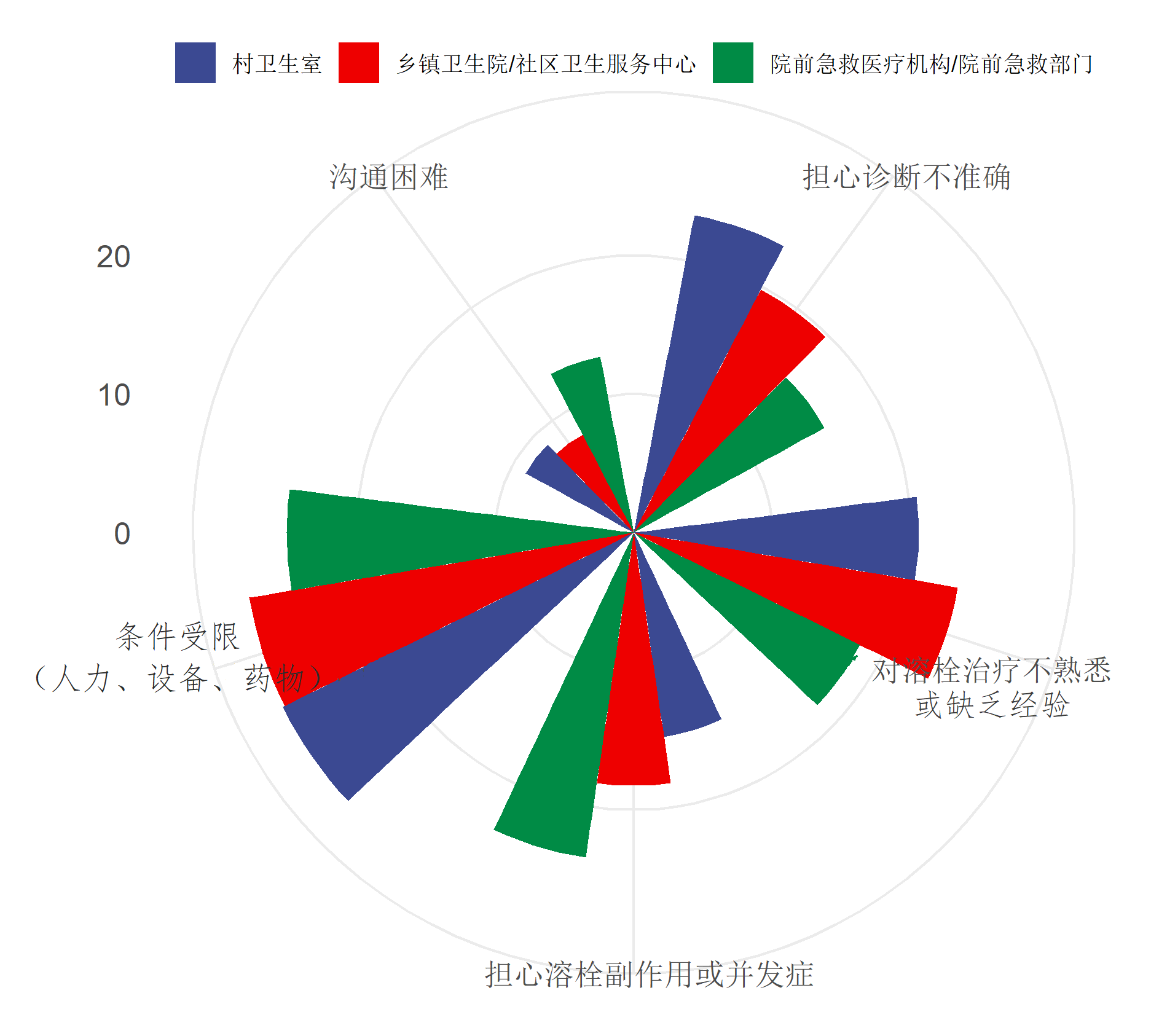 目前STEMI再灌注治疗主要包括药物溶栓治疗、PPCI及急诊外科冠状动脉旁路移植术。由于基层地区PPCI及外科旁路移植可及性差,药物溶栓治疗成为STEMI患者再灌注治疗的首选。与院内溶栓相比,院前早期溶栓可降低早期病死率17%,尤其是发病 < 120 min的患者。每治疗1 000例发病6 h内的STEMI患者,可以减少30例早期死亡[6-9]。所以,早期院前溶栓治疗,及时恢复心肌再灌注,对于降低STEMI患者病死率具有重要的意义。然而,由于种种原因我国院前溶栓治疗率普遍较低,尚未有效推广,且缺乏院前溶栓现状分析。为此,本研究通过对院前急救医师和基层乡镇卫生院/社区卫生服务中心医师开展问卷调查,了解基于基层乡镇卫生院/社区卫生服务中心、村卫生室、救护车等的STEMI院前溶栓治疗现状和影响实施溶栓治疗的因素,分析原因,提出解决方案,为全国基层医疗机构和院前急救开展院前溶栓提供救治策略和指导。