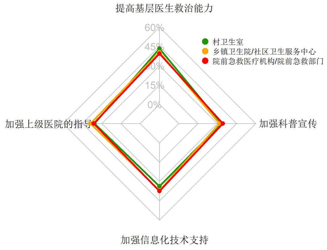 本调查结果显示,不论是在村卫生室、乡镇卫生院/社区卫生服务中心,还是院前急救医疗机构/二级以上医疗机构院前急救部门,医师认为要改变目前STEMI院前溶栓的现状,排在前4位的措施依次为提高基层医生救治能力共92.22%、加强上级医院指导共84.99%、加强信息化技术支持共83.37%、加强科普宣传共74.75%。见图 2。