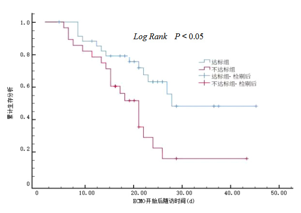 生存分析结果显示,达标组患者住院生存率(67.65%)高于未达标组(29.63%),两组比较差异有统计学意义(P < 0.05)(图 1)。