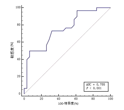图 2 ECMO第7天EN摄入量占目标能量比值预测出院死亡ROC曲线 Fig 2 Predicting discharge mortality ROC curve using the ratio of EN intake to target energy on the 7th day of ECMO |