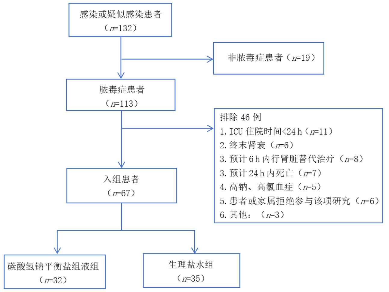 2 结果 2.1 入组流程2021年7月至2023年6月期间入住扬州市江都人民医院重症医学科患者中,符合Sepsis 3.0诊断标准的脓毒症患者共113例,根据排除标准排除46例:ICU住院时间小于24 h患者11例,终末肾衰患者6例,预计6 h内行肾脏替代治疗患者8例,预计24 h内死亡7例,严重高钠、高氯血症患者5例。最终共67例患者纳入研究,32例被随机分配至碳酸氢钠平衡盐液组,35例被随机分配至生理盐水组,入组流程如图 1所示。