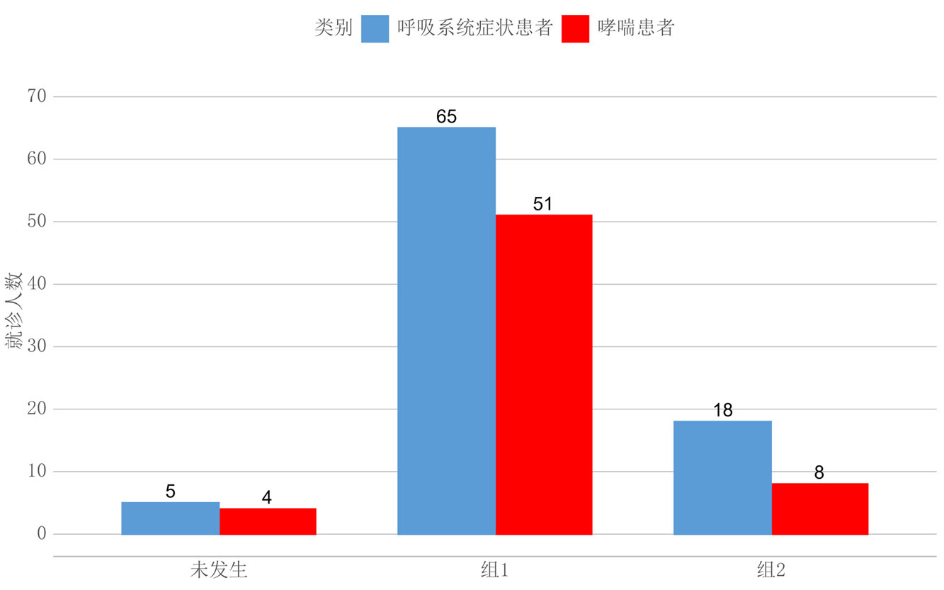 2 结果 2.1 不同时间段急性呼吸系统症状就诊患者情况2022年9月8日和2022年9月19日前后7 d时间共有156例因呼吸系统症状就诊于宁夏医科大学总医院的患者,其中最终明确诊断为哮喘的患者97例。雷暴发生后4 d内为呼吸系统症状患者就诊的高峰,第二次雷暴发生后以呼吸系统症状就诊的患者持续时间较长。而最终诊断为哮喘的患者则在雷暴发生后的3 d内,第二次雷暴发生后哮喘患者就诊的数量也存在平台期,持续时间约为5 d(图 1)。分别对雷暴发生前4 d(未发生)、第一次和第二次雷暴发生后的4 d(组1、组2)进行统计分析,结果发现雷暴未发生时以急性呼吸系统症状就诊的就患者共计有5例,明确诊断为哮喘的患者为4例;第一次雷暴发生后的4 d共计有65例因呼吸系统症状就诊的患者,明确诊断为哮喘的患者为51例;第二次雷暴发生后的4 d共计有18例因呼吸系统症状就诊的患者,而明确诊断为哮喘的患者仅为8例(图 2)。