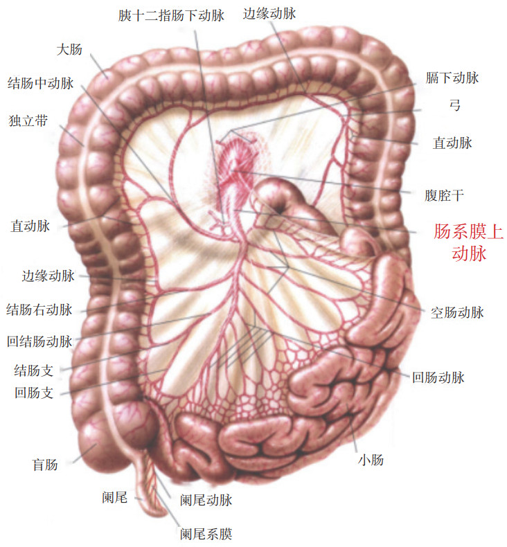 图 1 肠系膜上动脉及至大小肠的主要分支示意图 |