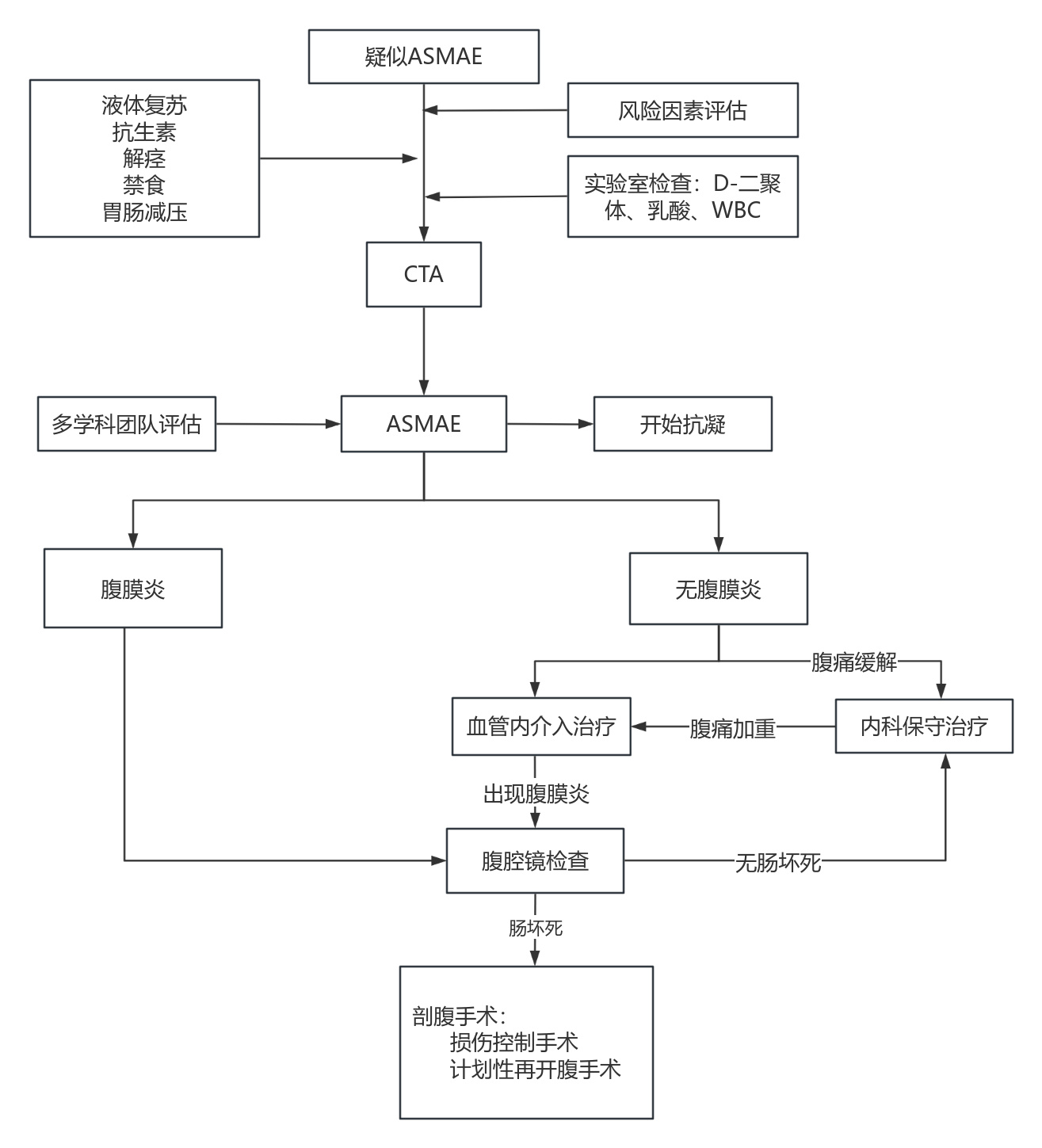 7 预后ASMAE是一种病死率很高的外科急腹症,早期诊断和及时治疗对于改善预后至关重要。研究[77]表明,有多个因素与ASMAE患者病死率增加相关,这些因素包括房颤、慢性肾脏疾病、糖尿病、高龄等。然而,由于该病的临床表现无特异性,易出现诊断延迟,导致许多患者在确诊时已出现肠坏死等严重并发症。因此,对于有高危因素的患者应提高警惕,及时完善相关检查以尽早确诊。