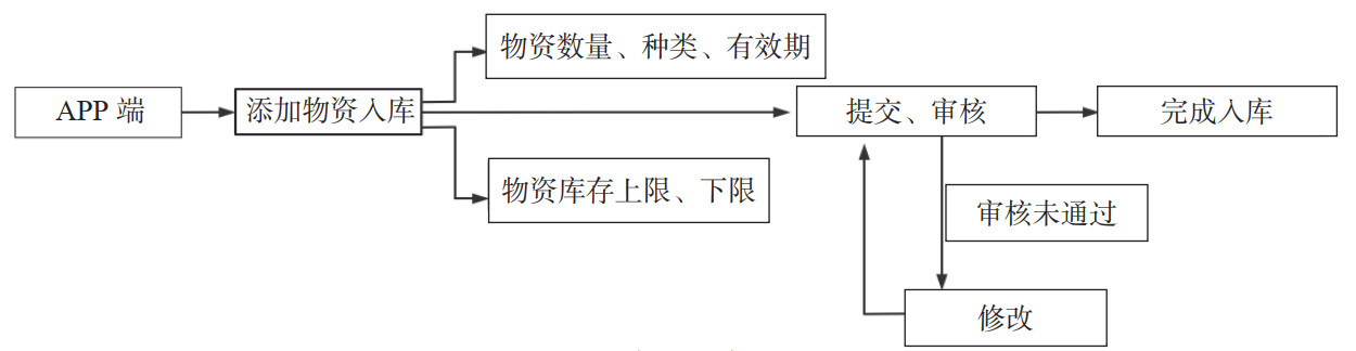 ④ 新增物资出入库实现精细化管理:包括录入货品名称和有效期、设置库存预警、设施仓库信息等,并由专人审核通过后完成入库。
