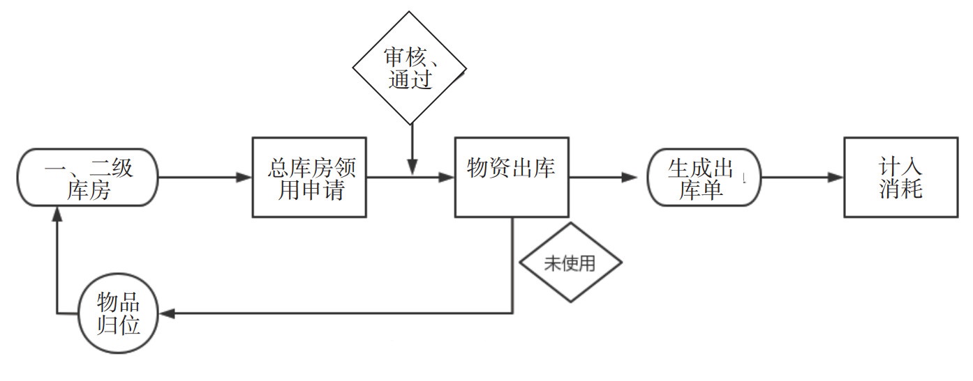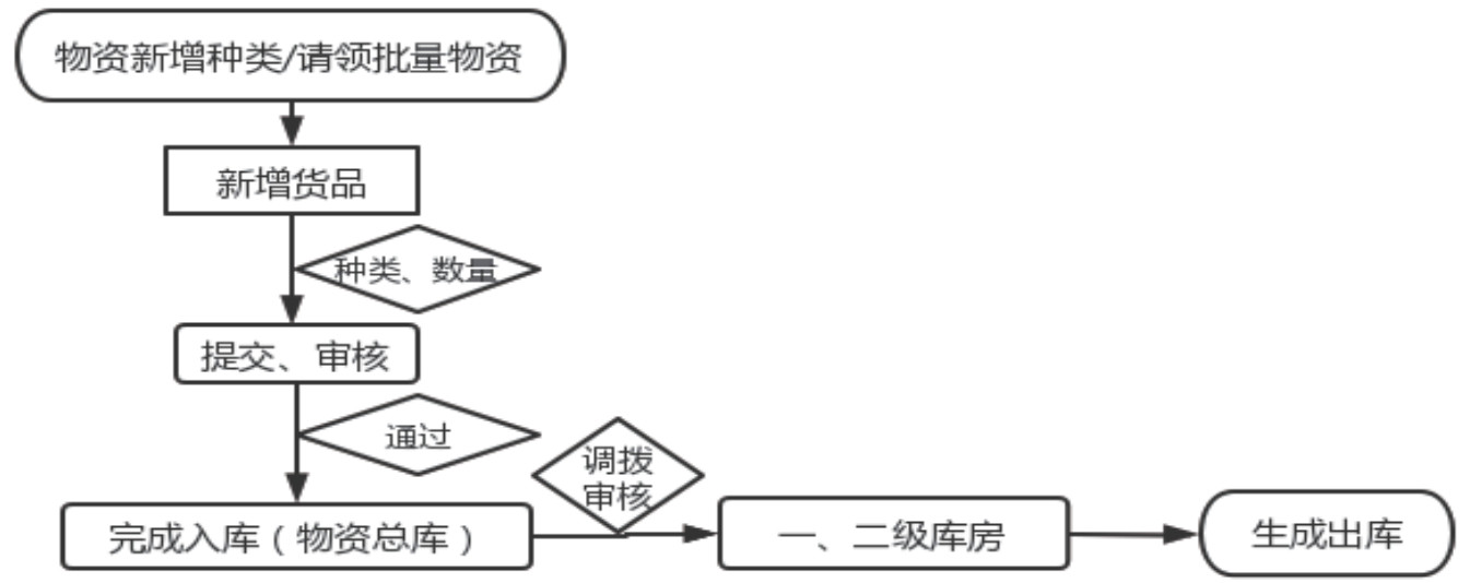 ① 整理(SEIRI),耗材管理人员每次请领后的保障物资耗材进行分类整理,放入总库房,弃去过期的、破损的保障物资耗材。并将整理好的保障物资耗材数据录入到保障物资管理APP中,录入的数据包括保障物资耗材的种类、名称、数量、有效期和所在库房,入库流程图见图 2,出库流程图见3,新增物资出入库流程图见图 4。