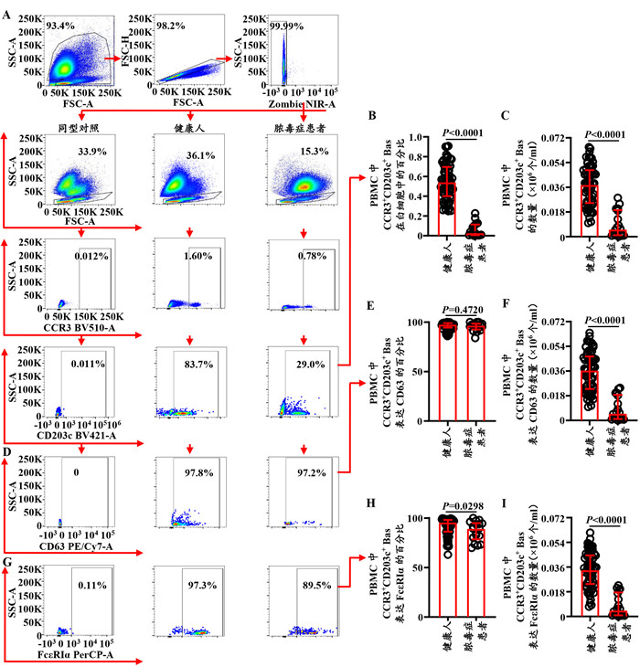 1 材料与方法 1.1 材料人红细胞裂解液、BV510-小鼠抗人CCR3单克隆抗体及其同型抗体BV510耦合的小鼠IgG2b κ、BV421-小鼠抗人CD203c单克隆抗体及其同型抗体BV421耦合的小鼠IgG1 κ、PE/Cy7-小鼠抗人CD63单克隆抗体及其同型抗体PE/Cy7耦合的小鼠IgG1 κ、PerCP-小鼠抗人FcεRIα单克隆抗体及其同型抗体PerCP耦合的小鼠IgG2b κ、人Fc受体阻断剂、Zombie NIRTM活细胞染料购自美国Biolegend;人多因子检测试剂盒(含IL-1β、IL-9和IL-10)购自美国R & D Systems;青链霉素混合液、FBS和RPMI 1640培养液购自美国Gibco BRL;Trizol试剂购自美国Invitrogen;人Bas分选试剂盒Ⅱ和MACS洗涤缓冲液购自德国Miltenyi Biotec;Lymphoprep购自挪威AXIS-SHIELD PoC AS。
