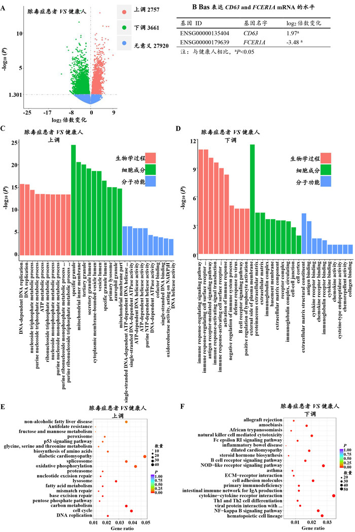 | 注:脓毒症患者和健康人PBMC中Bas差异表达基因的火山图(A);B:脓毒症患者PBMC中Bas CD63和FCER1A mRNA的表达水平;脓毒症患PBMCBas差异表达上调(C、E)和下调(D、F)基因的GO功能和KEGG信号通路富集分析图 图 3 转录组学分析脓毒症患者PBMC中的Bas Fig 3 RNA-seq analysis of Bas in PBMC of patients with sepsis |