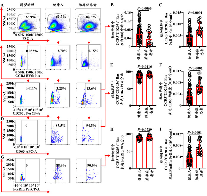 2 结果 2.1 脓毒症患者PBMC中Bas和FcεRIα+ Bas的比例和数量减少与健康人相比,脓毒症患者PBMC中Bas的比例和数量分别减少了94.8%(Z=-6.441,P < 0.01;图 1A、B)和85.7%(Z=-5.725,P < 0.01;图 1C)。分别有97.8%和96.9%的健康人和脓毒症患者的Bas表达CD63,且其表达比例在健康人和脓毒症患者间差异无统计学意义(Z=-0.727,P=0.472;图 1D、E),而脓毒症患者PBMC中CD63+ Bas的数量减少了85.7%(Z=-5.737,P < 0.0001;图 1F)。此外,脓毒症患者PBMC中FcεRIα+Bas的比例和数量较健康人分别减少了6.58%(Z=-2.164,P=0.0298;图 1G、H)和86.6%(Z=-5.805,P < 0.0001;图 1I)。