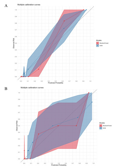 | 图 2 RF和SVM模型训练集(A)与验证集(B)的校准曲线 Fig 2 Calibration curves of the training set (A) and validation set (B) for the RF and SVM models |
