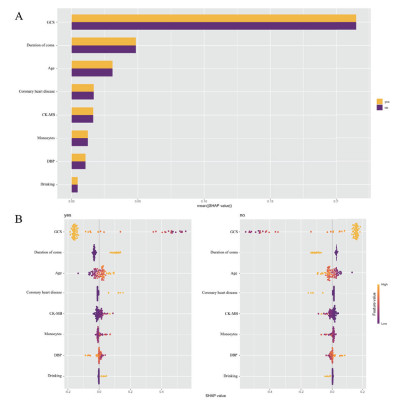 应用SHAP方法对RF预测模型进行可视化和解释,并得到每个特征对结局事件的影响及与结局的关系。如图 4A所示,影响因素的权重由高到低依次是GCS评分、昏迷时间、年龄、既往冠心病史、CK-MB水平、单核细胞水平、DBP、饮酒史(见图 4)。各变量与结局的关系如图 4B所示,以GCS评分为例,随着GCS评分降低,SHAP值逐渐增大,发生DEACMP的可能性越大。在临床工作中,对于单个患者,即可根据此模型得出发生DEACMP的概率。