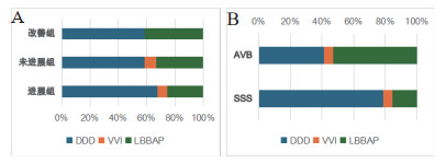 对两组起搏器适应证(AVB、SSS)的不同起搏模式(DDD、VVI、LBBAP)占比进行分析,AVB组VVI 5.9%,DDD 41.2%,LBBAP 52.9%;SSS组VVI 6%,DDD 78.6%,LBBAP 15.4%。两组间差异有统计学意义(P<0.001)。如图 2B。