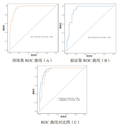 | 图 2 ROC曲线对比图 Fig 2 Training set ROC curve (A) Validation set ROC curve (B) Figure 2 Comparison of ROC curves (C) |