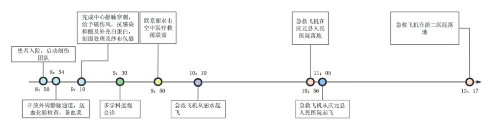 9:50联系丽水市空中医疗救援联盟,10:10分急救飞机从丽水起飞,10:56庆元县人民医院落地,11:05庆元县人民医院起飞,13:17浙大二院解放路院区落地。