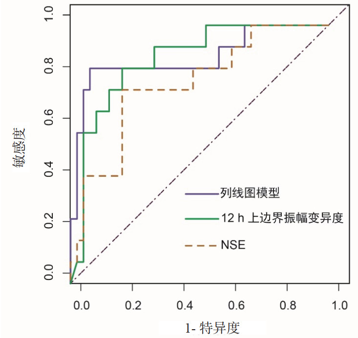 | ROC为受试者工作特征曲线,NSE为神经元特异度烯醇化酶 图 2 列线图模型12 h上边界变异度及NSE的ROC曲线比较 Fig 2 Comparison of nomogram model, 12 h boundary variation, and NSE by ROC curve |