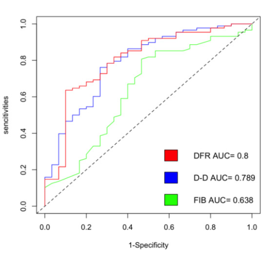 | 图 2 DFR指数、D-二聚体和纤维蛋白原的ROC曲线 Fig 2 ROC curves of DFR index, D-dimer, and fibrinogen |