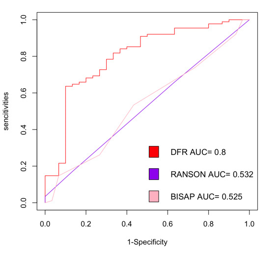 | 图 3 DFR指数、Ranson评分和BISAP评分的ROC曲线 Fig 3 ROC curves of the DFR index, Ranson score, and BISAP score |