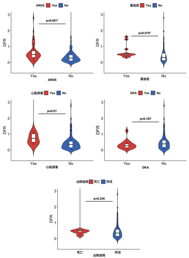 比较HTGAP并发症中DFR指数水平可见,DFR水平在HTGAP合并ARDS组、合并菌血症(血培养阳性)组、合并心肌损害(肌钙蛋白值高于正常参考值上限的第99百分位数)组均高于对照组(P<0.05)(图 3A-C)DFR水平在HTGAP是否合并DKA、是否死亡分别两组比较,差异无统计学意义(P>0.05)(图 4D-E)。