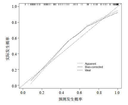 | 图 3 列线图模型的校准曲线 Fig 3 The calibration plot for the nomogram model |