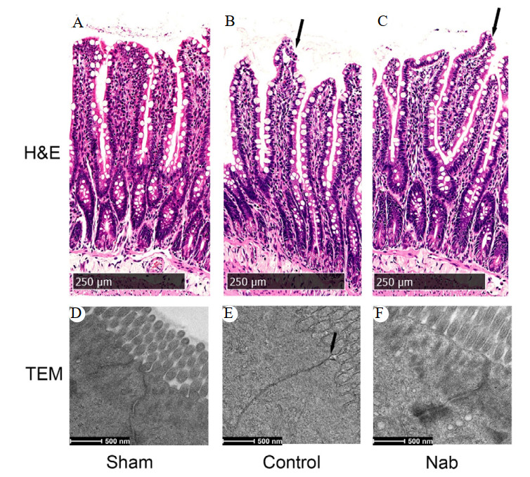 | 注:图A~C分别为光镜下假手术组、单纯心肺复苏组及丁酸钠组回肠上皮组织情况(×200);图D~F分别为电镜下假手术组、单纯心肺复苏组及丁酸钠组回肠上皮组织情况(×50 000) 图 1 各组大鼠回肠上皮病理学评估 Fig 1 Pathological evaluation of ileal epithelium of rats in each group |