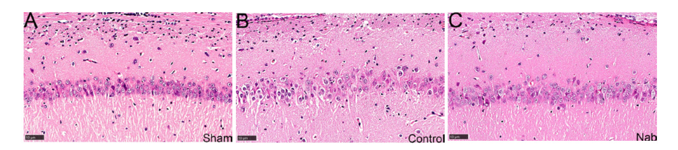 | 注:图A~C分别为光镜下假手术组、单纯心肺复苏组及丁酸钠组海马CA1区组织情况(×600) 图 2 各组大鼠脑组织CA1区形态学观察 Fig 2 Morphological observation of the CA1 region of rats from each group |
