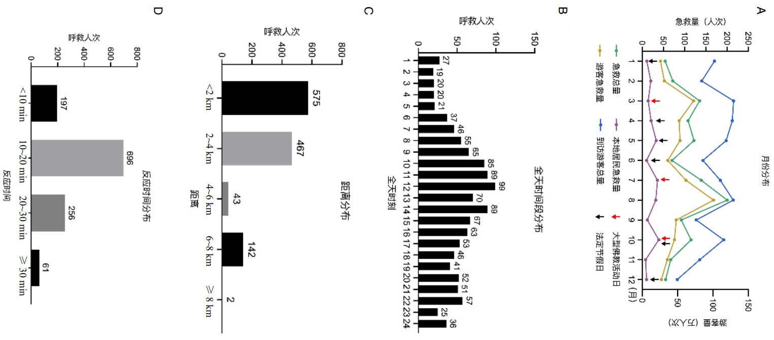 | 注:图A为全年急救病例的月份分布;B为全年急救病例的全天时间段分布;C为全年急救病例院前急救距离分布;D为全年急救病例院前急救反应时间分布 图 1 2023年普陀山1 229例院前急救病例的分布特点 |