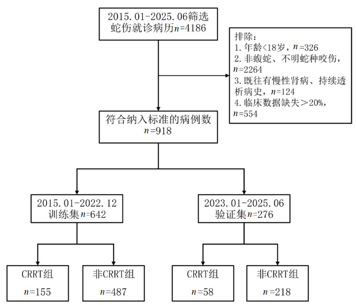 1 资料与方法 1.1 研究对象本研究为单中心、回顾性、观察性研究,以解放军中部战区总医院急诊医学科2015年1月至2025年6月收治的蛇咬伤患者作为研究对象。其中2015年1月至2022年12月的数据作为训练集用于模型构建,2023年1月至2025年6月的数据作为验证集集用于测试模型的性能。纳入标准:(1)年龄≥16岁;(2)明确为蝮蛇咬伤的患者;(3)咬伤部位为四肢;(4)对于多次住院的蛇咬伤患者,仅收集首次“蝮蛇咬伤”的就诊数据。排除标准:(1)年龄 < 16岁;(2)其他毒蛇咬伤或不明蛇种咬伤者;(3)既往有血液系统疾病、慢性肾病等;(4)依从性差,未规范注射抗蝮蛇毒血清者;(5)外院已行CRRT治疗者;(6)临床资料数据缺失 > 20%。