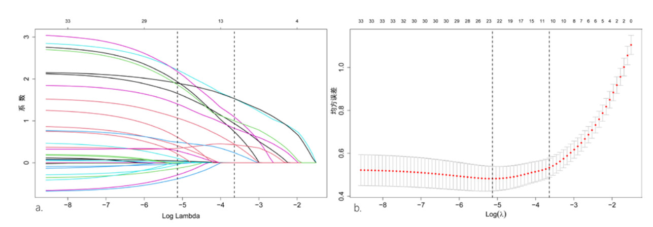 | 注:a为20个变量的系数曲线,b为筛选最优λ过程 图 2 使用LASSO回归模型筛选预测变量 Fig 2 Selection of predictions of prostate biopsy using the LASSO binary logistic regression model |