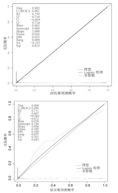 LASSO作为一种强大的特征选择和回归分析工具,具有自动特征选择、降低模型复杂度、有效预防过拟合及解决多重共线性等显著优势[16]。如图 2所示,本研究使用LASSO回归对训练集中的所有变量进行筛选,并使用10倍交叉验证来选择λ。若以λ.min作为最优λ值(λ=0.0086),最终模型中会包含20个变量,使得模型过于复杂,可能存在过拟合的风险。而在1个方差范围内选择λ.1se为最优λ值(λ=0.0264),模型中则包含10个变量,降低模型复杂度的同时又具有较好的预测性能。因此,最终选择λ.1se作为本研究中的最优λ值。LASSO回归纳入的10个预测变量有:意识状态(嗜睡、昏睡、昏迷)、肿胀程度3级、NLR值(10~15、> 15)、AST/ALT值(> 3)、钾(≥4mmol/L)、Cr(≥68 μmol/L)、CK/LDH值(> 3.5)。