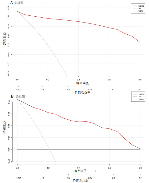 使用训练集和验证集的数据对该预测模型进行验证和评价。ROC曲线用于评估模型的区分度,结果显示,训练集的AUC为0.961(95%CI: 0.946~0.976),最佳阈值为0.242,敏感度89.5%,特异度93.9%(图 4A);验证集的AUC为0.954(95%CI: 0.931~0.977)(图 4B),表明该模型区分性能佳,能很好地预警蝮蛇咬伤患者48 h内需要行CRRT治疗。拟合优度检验用于评估该模型的拟合程度,结果显示训练集P=0.855,验证集P=0.105,表明该模型拟合良好。校准曲线用于评估模型拟合程度和预测精度,结果显示训练集与验证集中的校准-偏差曲线与实际曲线拟合良好,与理想曲线相差较小(图 5)。预测模型在训练集和验证集的决策曲线分析中显示(图 6):当阈概率在1%至90%的范围内,患者的净获益比两条极端曲线都高,证明了模型良好的泛化能力和稳定的临床实用价值。
