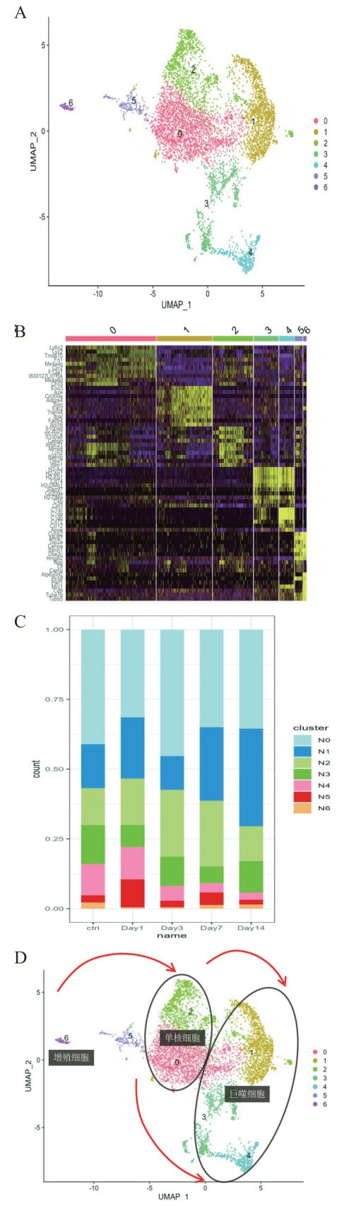 树突状细胞(dendritic cell,DC)是固有免疫与获得性免疫的桥梁细胞。根据不同亚群表达谱不同,将树突状细胞分为DC0、DC1、DC2、DC3、DC4等5群细胞(图 5A)。DC0高表达Cxcl12、Fabp1等,DC1高表达CC了6、CD63等,DC2高表达Rpl13、Rps26等,DC3高表达S100A8、S100A9等,DC4高表达Mki67等,表明DC4可能为祖细胞(图 5B)。进一步分析结果显示DC0细胞在脓毒症后第1天增加,第3天后恢复正常(图 5C),DC3在第3天逐渐增加,第7天逐渐恢复正常(图 5C)。