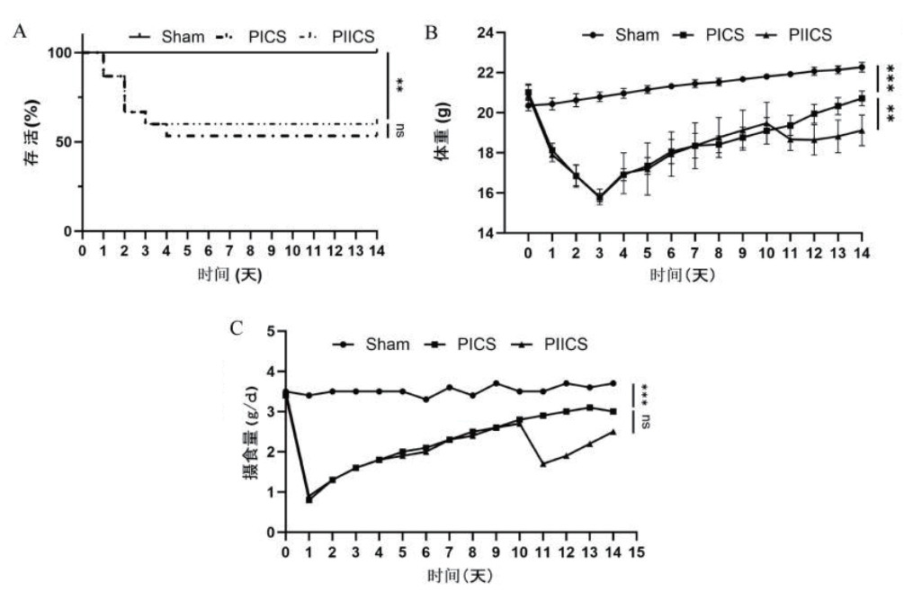 2 结果 2.1 小鼠生存率、体重及摄食量变化连续14 d监测了各组小鼠的生存率和体重变化。如图 1A所示,与Sham组相比,PICS组与PIICS组小鼠的14 d累积生存率显著降低(P < 0.05)。体重变化趋势如图 1B所示。Sham组小鼠体重在观察期内呈现稳步增长。相反,PICS组和PIICS组小鼠体重在术后3 d内急剧下降。从第4天起,PICS组小鼠体重停止下降并开始缓慢恢复。PIICS组小鼠体重同样在第4天后开始回升,但在第11天经LPS二次打击后,其体重增加趋势显著减慢(P < 0.05)。摄食量如图 1C所示。与Sham组相比,PICS组和PIICS组小鼠术后摄食量均显著降低(P < 0.05)。Sham组小鼠摄食量在14 d观察期内维持稳定水平。PICS组小鼠摄食量在术后第1天急剧下降,随后逐步恢复。PIICS组小鼠摄食量变化趋势与PICS组相似,第11天经LPS二次打击后,PIICS组小鼠摄食量出现一过性下降,但与PICS组相比差异无统计学意义(P > 0.05)。见图 1。