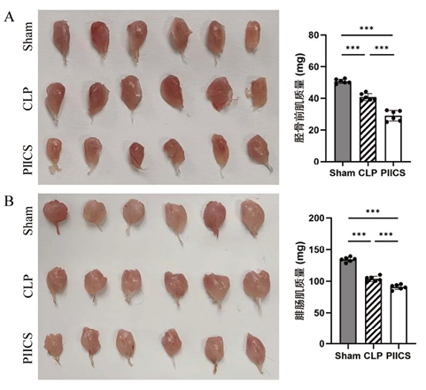 为评估肌肉质量的变化,在实验终点测量了小鼠后肢胫骨前肌和腓肠肌的湿重。结果显示,与Sham组相比,CLP组的胫骨前肌和腓肠肌湿重降低差异有统计学意义(P < 0.05),表明脓毒症成功诱导了肌肉萎缩。进一步比较发现,与CLP组相比,PICS组和PIICS组的胫骨前肌和腓肠肌湿重均进一步显著下降(P < 0.05),提示脓毒症晚期会加剧肌肉的消耗。见图 3及图 4。