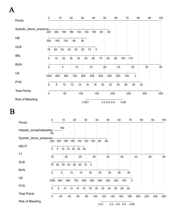 | 注:A为基于λ.min筛选变量的模型;B为基于λ.1se筛选变量的模型 图 2 肝硬化患者并发急性上消化道出血的列线图预测模型 Fig 2 Nomogram prediction model for acute upper gastrointestinal bleeding in patients with cirrhosis |