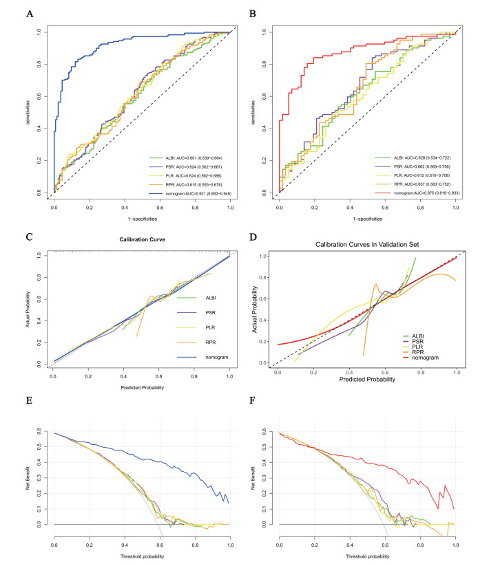 | 注:A、C、E为训练集,B、D、F为验证集 图 6 ALBI、PSR、PLR、RPR及列线图的ROC曲线、校准曲线、DCA曲线 Fig 6 ROC, Calibration, and DCA Curves of the ALBI, PSR, PLR, RPR and the Nomogram |