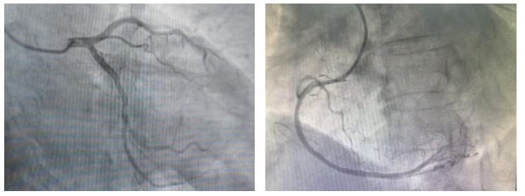 | 图 3 冠脉造影结果显示左主干、前降支、回旋支及右冠状动脉血管通畅,未见明显狭窄或血栓形成 |