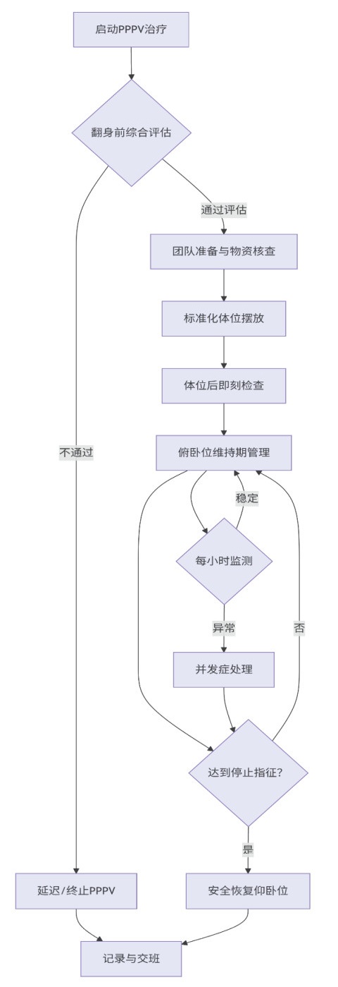 2.2 临床实践长程俯卧位通气(PPPV)的实施需多团队标准化协作。建议由4~5名训练有素人员共同执行,备齐专用枕垫、防压疮材料及急救设备。首先进行深度镇静镇痛,必要时使用肌松剂,妥善固定气道及各类管路,预吸痰并暂停肠内营养。翻身时需专人指挥,统一行动,采用轴向翻身法将患者转为俯卧位。体位安置时,头部置于专用软枕并偏向一侧,定期更换方向;胸廓、骨盆及下肢需垫软枕支撑,保持腹部悬空,以减轻膈肌压迫。同时需严密保护骨突处皮肤及双眼。每日暂停1次评估神经功能及并发症(压疮、角膜损伤等),俯卧位持续时间超过24 h,每次翻身前行内环境及血气监测。长程俯卧位实施流程图见图 1。