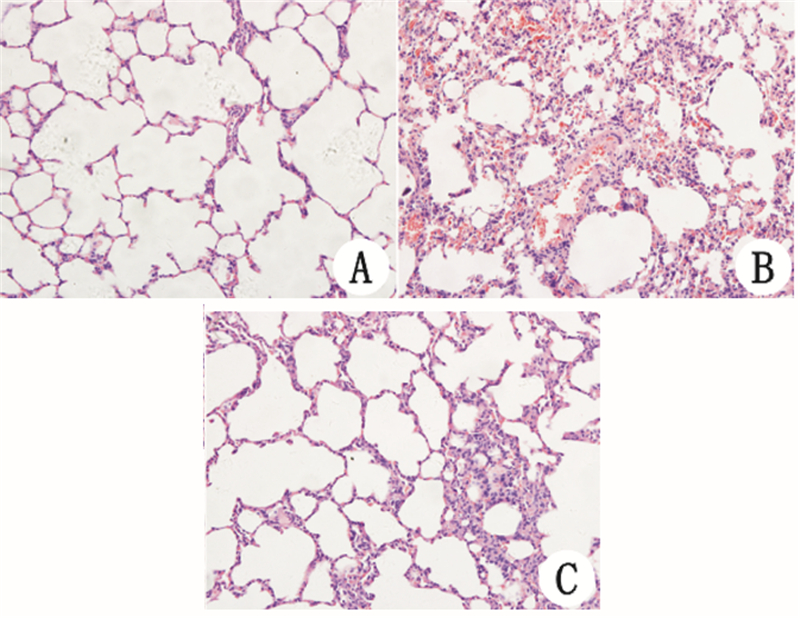 A: SO组;B: SAP组;C: HRS组 图 1 12 h大鼠肺组织病理改变 (HE×200) Fig 1 Morphologic change of lung tissues at 12h(HE×200) |