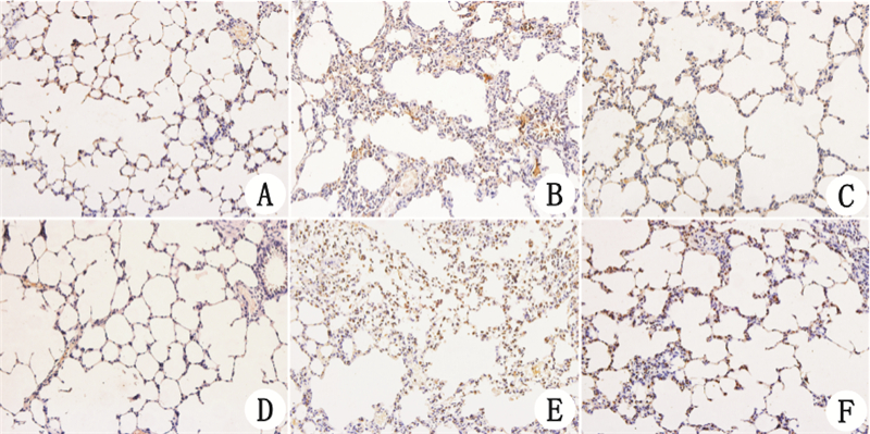 P38MAPK免疫组化 A: SO组;B: SAP组;C: HRS组 p-P38MAPK免疫组化 D: SO组;E: SAP组;F: HRS组 图 2 12 h大鼠肺组织P38MAPK及p-P38MAPK免疫组化(×200) Fig 2 Immunohistochemistry detection of the expression of P38MAPK and p-P38MAPK in lung tissues at 12h(×200) |