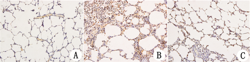 A: SO组;B: SAP组;C: HRS组 图 3 12 h大鼠肺组织NF-κB P65免疫组化(×200) Fig 3 Immunohistochemistry detection of the expression of NF-κB in lung tissues at 12h(×200) |