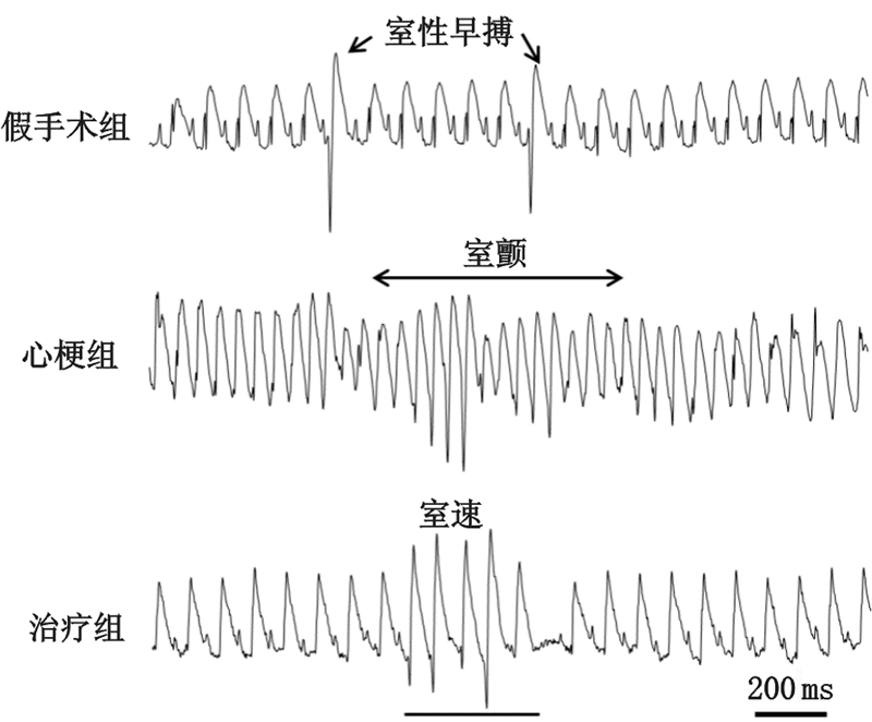 1.3 ECG记录心梗制作过程中,按体表肢体Ⅱ导联记录心梗前和心梗后30 min的ECG;记录完成后,将遥测ECG记录仪(型号EA-F40,Data Science International公司,美国)植入动物体内,连续记录24 h,以记录VAs发生情况。本研究纳入的分析的VAs包括:(1)室速 连续3及以上的室性早搏;(2)室颤 QRS形态和频率不断变化,难以分辨,代之以形态不等、频率不规则的颤动样波。以VAs的个数、持续时间来比较各组VAs易感性。
