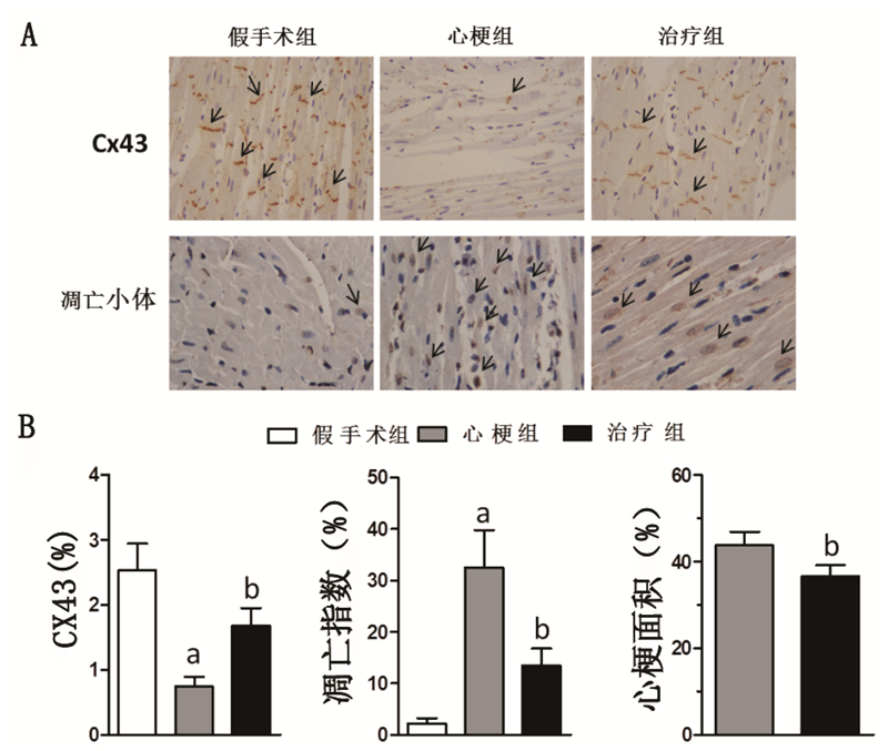 A:三组大鼠心脏典型的Cx43免疫组化图(X200)和凋亡小体TUNEL图(X200);B:三组大鼠心脏Cx43表达量、凋亡指数、心梗面积的比较;箭头表示阳性染色区;与假手术组比较,aP<0.01;与心梗组比较,bP<0.01 图 3 三组大鼠心脏Cx43表达、凋亡指数和心梗面积的比较 Fig.3 Comparison of Cx43 expression,apoptosis index and infarction area among three groups |