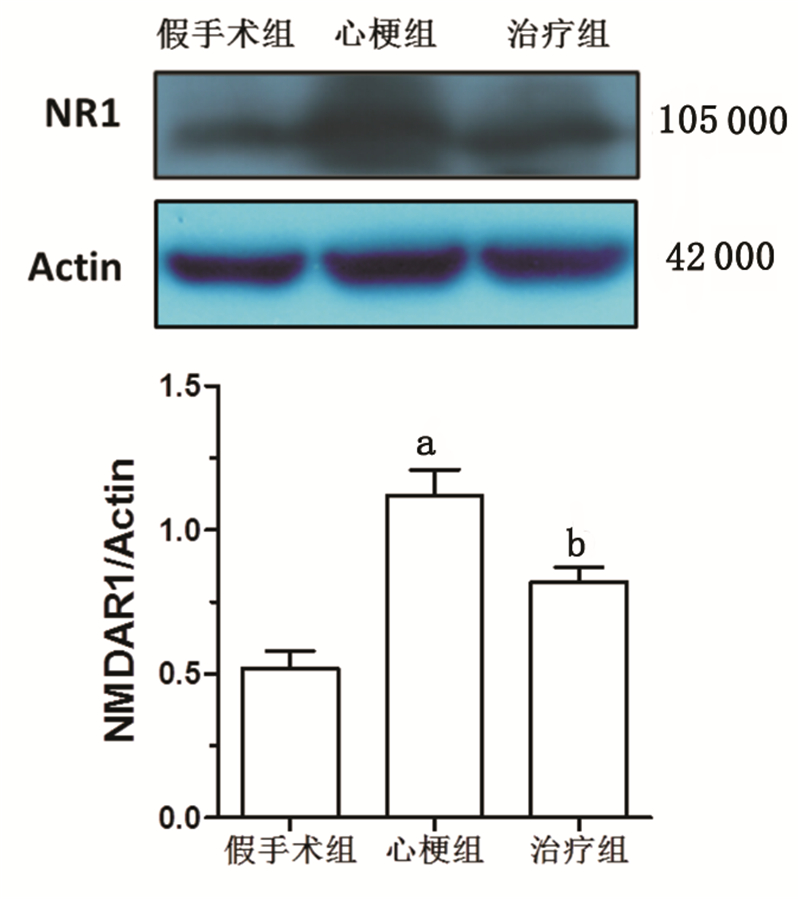 与假手术组比较,aP<0.01;与心梗组比较,bP<0.01 图 4 左心室NMDAR1表达量比较 Fig.4 Comparison of the NMDAR1 expression in left ventricle |
