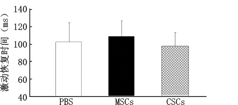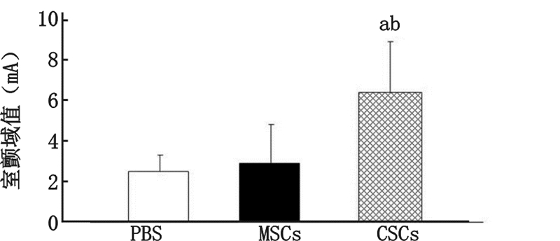 三组在梗死边缘区的室颤阈值对比,CSCs组与MSCs组及对照组比较差异均具有统计学意义(P<0.05),而MSCs组与PBS组比较,差异无统计学意义(P>0.05),见图 5。