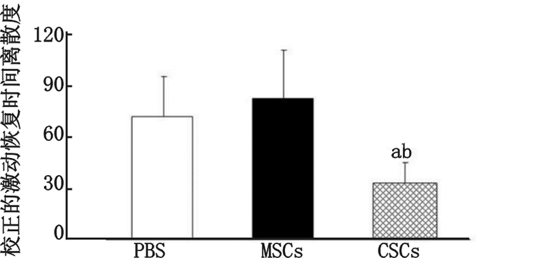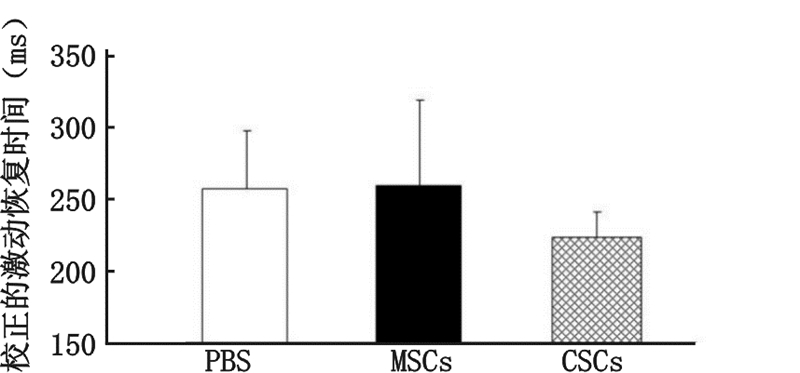 三组纠正的激动恢复时间离散度比较,CSCs组与MSCs组及对照组比较均差异具有统计学意义(P<0.05),而MSCs组与PBS组比较,差异无统计学意义(P>0.05),见图 3。