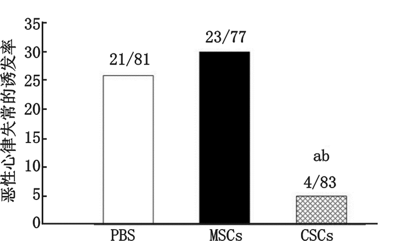 对照组在总共81次的程序电刺激中诱发出21次恶性心律失常,MSCs组在总共77次的程序电刺激中诱发出23次恶性心律失常,CSCs组在总共83次的程序电刺激中诱发出4次恶性心律失常,CSCs组与MSCs组及对照组比较差异均具有统计学意义(P<0.05),而MSCs组与PBS组比较,差异无统计学意义(P>0.05),见图 4。
