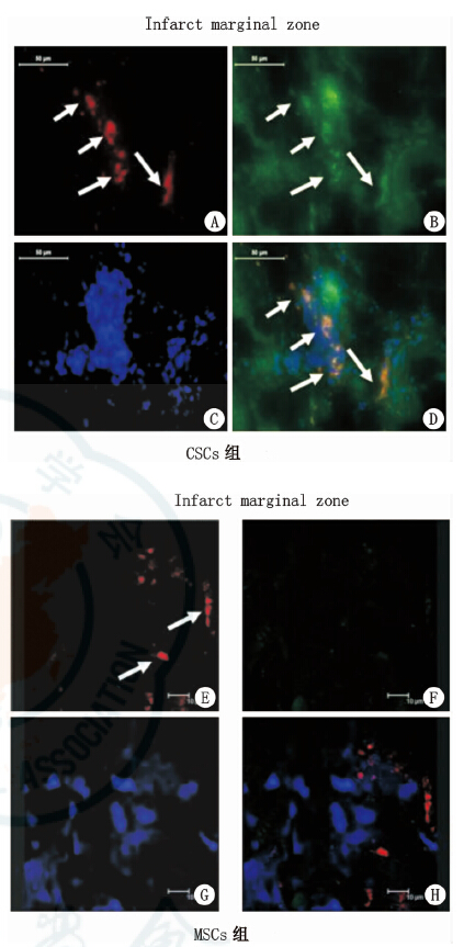 经激光共聚焦显微镜检测,大鼠心肌梗死边缘区可见红色 PKH26 标记的 CSCs 及 MSCs 存在,CSCs 组可以检测到绿色荧光标记的缝隙连接蛋白43。此外,可见CSCs分别与缝隙连接蛋白43荧光定位存在重叠,而 MSCs 组很少检测到绿色荧光标记的缝隙连接蛋白43(见图 6)。