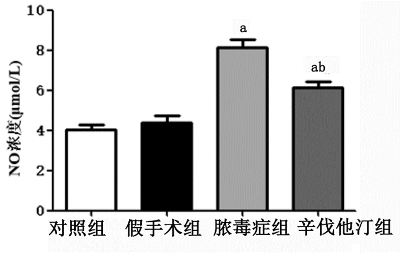 经试剂盒检测NO水平,从结果中可以看出,假手术组与对照组之间的差异无统计学意义;脓毒症组NO水平显著高于对照组(P<0.01);辛伐他汀组NO水平比对照组高(P<0.01),但NO水平显著低于脓毒症组(P<0.01),见图2。提示脓毒血症能上调NO水平,而辛伐他汀预处理能逆转脓毒症上调的NO水平。